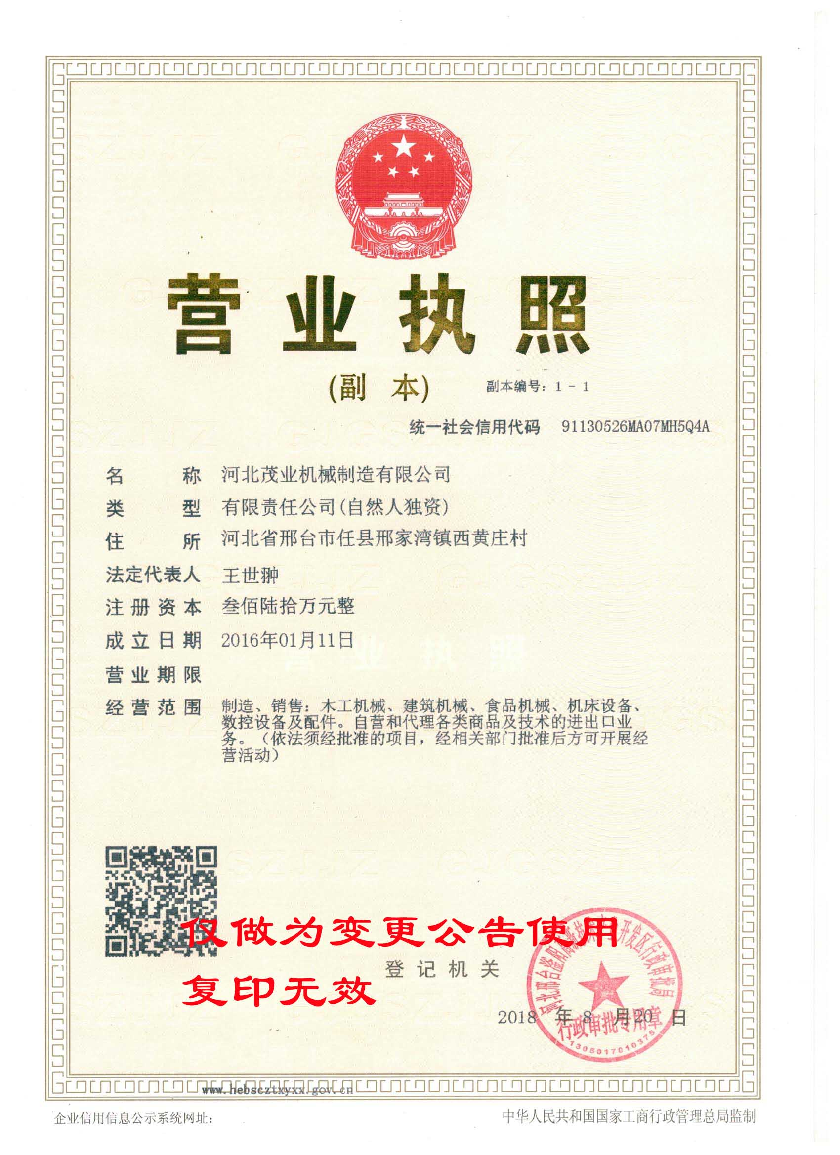 我司邢臺茂業(yè)機械制造有限公司,因公司業(yè)務(wù)發(fā)展的需要,現(xiàn)已整體變更為河北茂業(yè)機械制造有限公司,并于2018年8月20日取得河北邢臺滏陽高新技術(shù)產(chǎn)業(yè)開發(fā)區(qū)審批局頒發(fā)的營業(yè)執(zhí)照。現(xiàn)將有關(guān)事項公告如下: